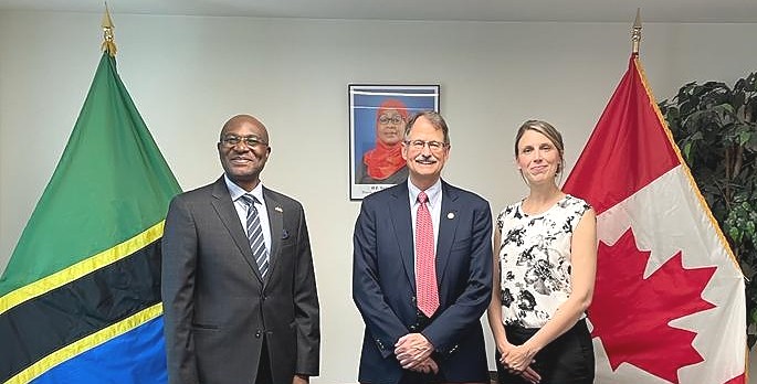 The High Commissioner of the United Republic of Tanzania to Canada, H.E Dr. Mpoki Ulisubisya (left), together with Ms. Andrea Helfer, Director for Fund Development and Marketing (right), and Mr. Christopher D. Bredt, Senior Counsel (middle) from CODE – a non-government organization in Canada after a fruitful conversation on promoting children's literacy in Tanzania.